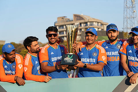 Indian players celebrate with the trophy after winning the T20 cricket series against Zimbabwe at the Harare Sports club, in Harare.