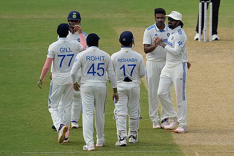 India's Ravichandran Ashwin, second right, celebrates with teammates the wicket of Bangladesh's captain Najmul Hossain Shanto on the first day of the second cricket test match between Bangladesh and India in Kanpur.