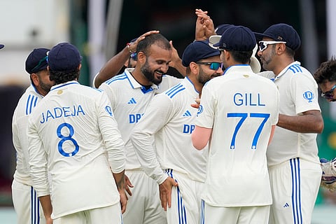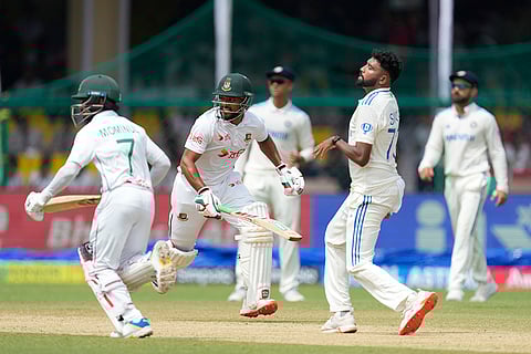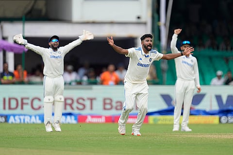 India's Akash Deep, center, celebrates with teammates the wicket of Bangladesh's Shadman Islam on the first day of the second cricket test match between Bangladesh and India in Kanpur.