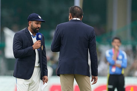 India's captain Rohit Sharma speaks after the toss before the start of the second cricket test match between Bangladesh and India in Kanpur.