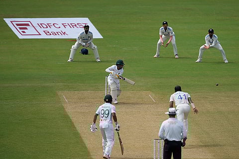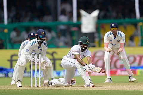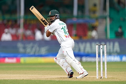 Bangladesh's captain Najmul Hossain Shanto plays a shot on the first day of the second cricket test match between Bangladesh and India in Kanpur.