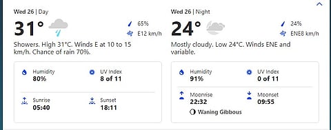 As per Weather.com, there are possibility of showers in the morning with 70% chance of rain. The temperature will be around 31 degrees Celsius.