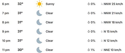 6:00 PM (32°C): Sunny and hot; 0% rain probability.