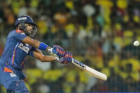 Lucknow Super Giants' Nicholas Pooran plays a shot during the Indian Premier League cricket match between Chennai Super Kings and Lucknow Super Giants in Chennai.