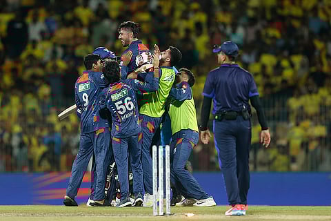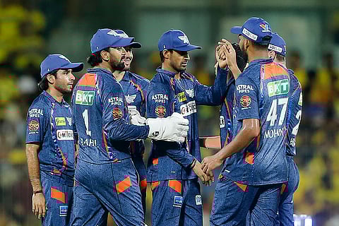 Lucknow Super Giants' team members celebrate the wicket of Chennai Super Kings' Chennai Super Kings' Daryl Mitchell during the Indian Premier League cricket match between Chennai Super Kings and Lucknow Super Giants in Chennai.