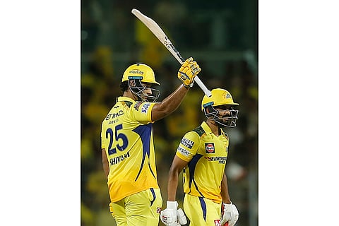 Chennai Super Kings' Shivam Dube celebrates scoring a half century during the Indian Premier League cricket match between Chennai Super Kings and Lucknow Super Giants in Chennai.