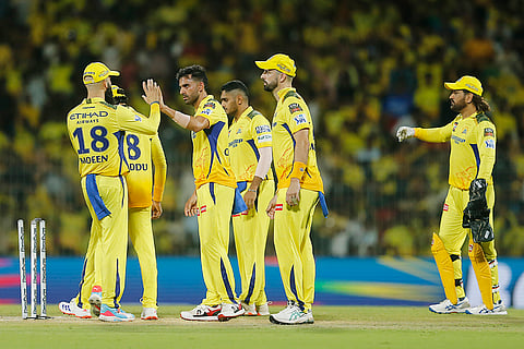 Chennai Super Kings' Deepak Chahar celebrates the wicket of Lucknow Super Giants' Quinton de Kock with teammates during the Indian Premier League cricket match between Chennai Super Kings and Lucknow Super Giants in Chennai.