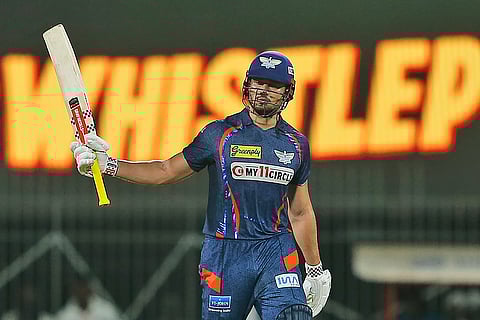 Lucknow Super Giants' Marcus Stoinis celebrates scoring a century during the Indian Premier League cricket match between Chennai Super Kings and Lucknow Super Giants in Chennai.