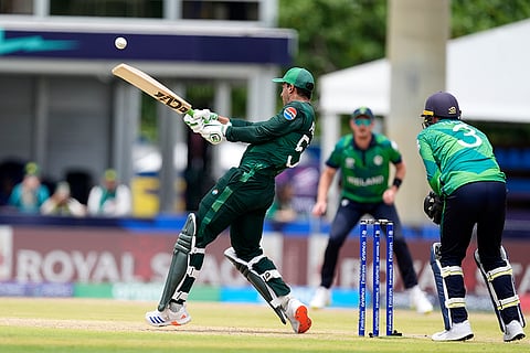 Pakistan's Abbas Afridi plays a shot during the ICC Men's T20 World Cup cricket match between Ireland and Pakistan at the Central Broward Regional Park Stadium, Lauderhill, Florida.
