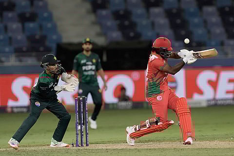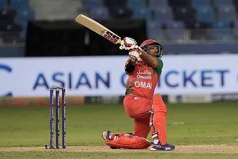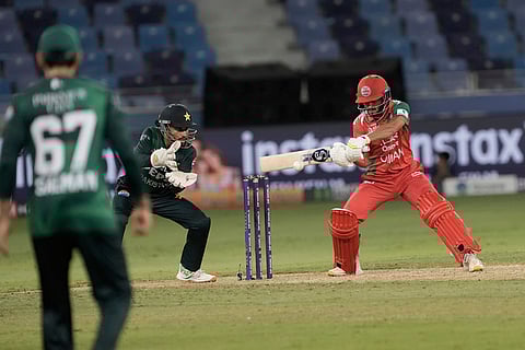 Oman's Hammad Mirza plays a shot during the Asia Cup Cricket match between Oman and Pakistan at Dubai International Cricket stadium in Dubai, United Arab Emirates.