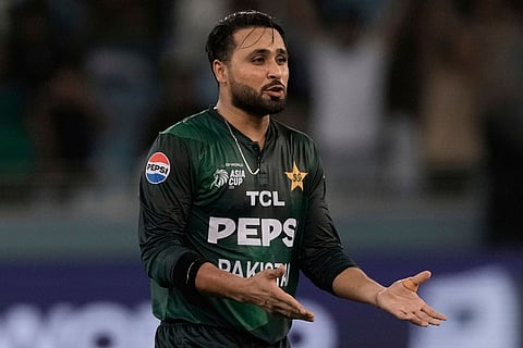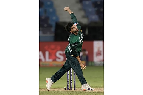 Pakistan's Sufiyan Muqeem bowls a delivery during the Asia Cup Cricket match between Oman and Pakistan at Dubai International Cricket stadium in Dubai, United Arab Emirates.