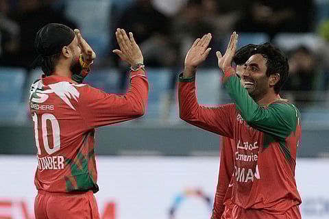 Oman's Aamir Kaleem, right, celebrates with teammates after the dismissal of Pakistan's captain Salman Agha during the Asia Cup Cricket match between Oman and Pakistan at Dubai International Cricket stadium in Dubai, United Arab Emirates.
