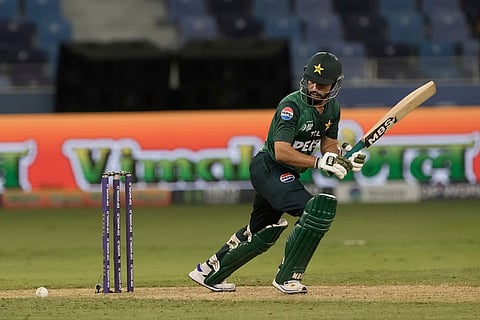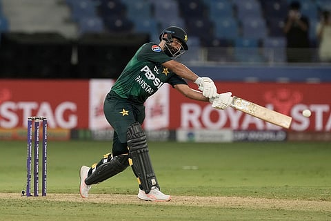 Pakistan's Mohammad Nawaz plays a shot during the Asia Cup Cricket match between Oman and Pakistan at Dubai International Cricket stadium in Dubai, United Arab Emirates.