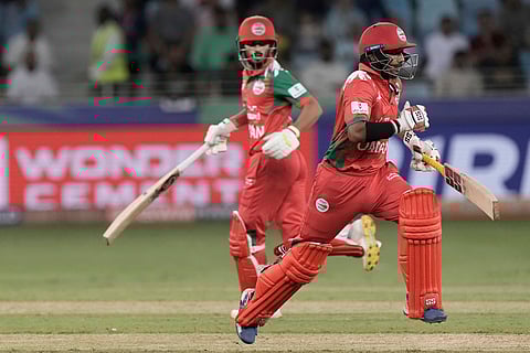 Oman's Aamir Kaleem, right, and Hammad Mirza run between the wickets to score during the Asia Cup Cricket match between Oman and Pakistan at Dubai International Cricket stadium in Dubai, United Arab Emirates.