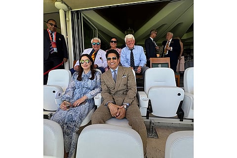 Sachin Tendulkar along with his wife Anjali (right) and pictured behind seated are Farrokh Engineer (Back left) and Barry Richards (right)