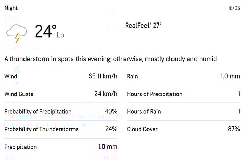 The cloud cover in Hyderabad stands at 87% with the probability of precipitation at 40% and probability of thunderstorms at 24. The Hyderabad crowd, however, should be in for a complete game with the Sunrisers looking to bag all two points.