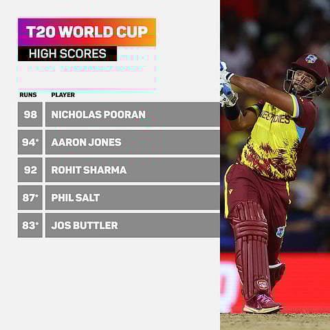 He also claimed the tournament's highest score, with his 98 from just 53 balls against Afghanistan on June 17, as the Windies set the highest score of the competition (218-5).
