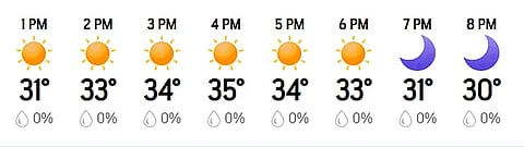 Ahmedabad is experiencing sunny daytime conditions with a temperature of 33°C. The humidity is at 24% with a UV index of 6, and there is a 0% chance of precipitation. Winds are light at 4 mph coming from the southwest, ensuring a clear and dry afternoon for the 3:00 PM IST start.
