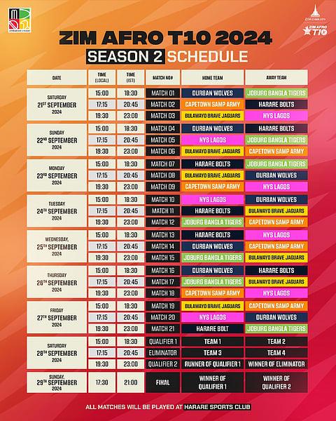 The second season of Zim Afro T10, Zimbabwe's flagship T10 league, is about to get underway. The franchises have got their squads in place and the Harare Sports Club is ready for the tournament, which begins on September 21 and will finish with the grand finale on September 29. (More Cricket News)