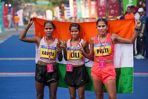 India's Lily Das, Kavita and Priti pose for pictures after finishing first, second and third respectively in the 'Elite Indian Female' category of Vedanta Delhi Half Marathon 2024, at JLN stadium in New Delhi.