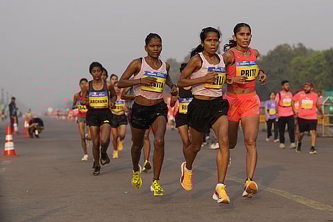 Participants during Vedanta Delhi Half Marathon 2024, in New Delhi.