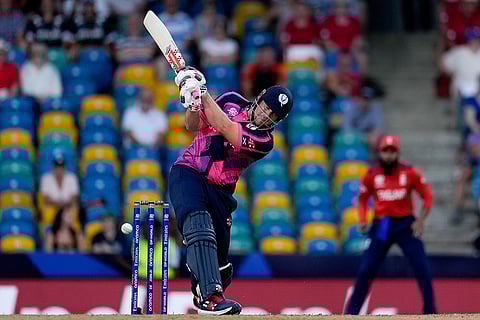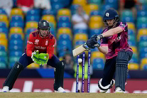 Scotland's George Munsey plays a shot from the bowling of England's Chris Jordan during an ICC Men's T20 World Cup cricket match at Kensington Oval in Bridgetown, Barbados.