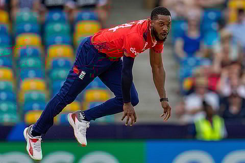 England's Chris Jordan bowls against Scotland during an ICC Men's T20 World Cup cricket match at Kensington Oval in Bridgetown, Barbados.