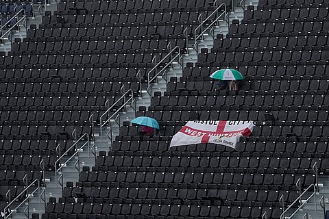 Fans remain in the stands as rain interrupts an ICC Men's T20 World Cup cricket match between Scotland and England at Kensington Oval in Bridgetown, Barbados