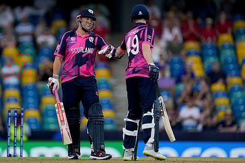 Scotland's batsmen George Munsey and Michael Jones bump gloves during their partnership against England at an ICC Men's T20 World Cup cricket match at Kensington Oval in Bridgetown, Barbados.