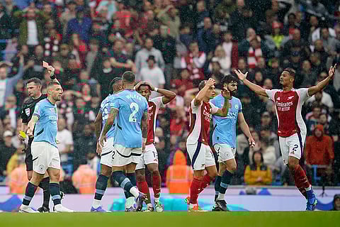 Arsenal's Leandro Trossard, third right, reacts after getting a red card during the English Premier League soccer match between Manchester City and Arsenal at the Etihad stadium in Manchester, England.