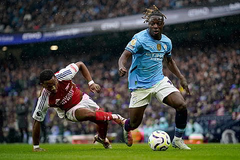 Manchester City's Jeremy Doku gets away from Arsenal's Jurrien Timber during the English Premier League soccer match between Manchester City and Arsenal at the Etihad stadium in Manchester, England.