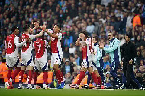 Arsenal players react after Manchester City's John Stones scored an equaliser in the English Premier League soccer match between Manchester City and Arsenal at the Etihad stadium in Manchester, England.