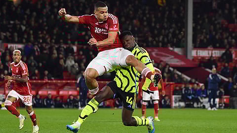 Nottingham Forest's Harry Toffolo, left, challenges for the ball with Arsenal's Gabriel Jesus, left, during the English Premier League soccer match between Nottingham Forest and Arsenal at the City Ground stadium in Nottingham, England.