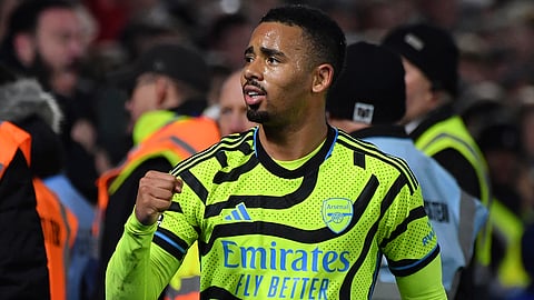 Arsenal's Gabriel Jesus celebrates after scoring his side's opening goal during the English Premier League soccer match between Nottingham Forest and Arsenal at the City Ground stadium in Nottingham, England.