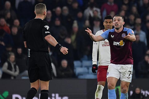 Aston Villa's John McGinn, right, complains to the referee Robert Jones during the English Premier League soccer match between Aston Villa and Manchester United at the Villa Park stadium in Birmingham, England.