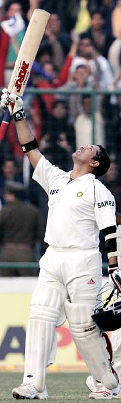 A six-over long-on off Malinga Bandara saw Tendulkar move into the 80s. A leg glance off Vaas saw him move from 93 to 97, and after an outside edge off Fernando fell short of first slip, Tendulkar reached the milestone in the next overfrom Vaas and threw up his arms and punched the air in elation.