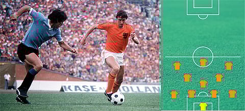 A 4-3-3? Maybe. This is just an attempt to nail these 11 players down on paper. On the pitch however, this team played high up in the opposition half, pressed like a Jurgen Klopp side and changed positions seamlessly. What was later called ‘Total Football’ influenced many a manager over the years