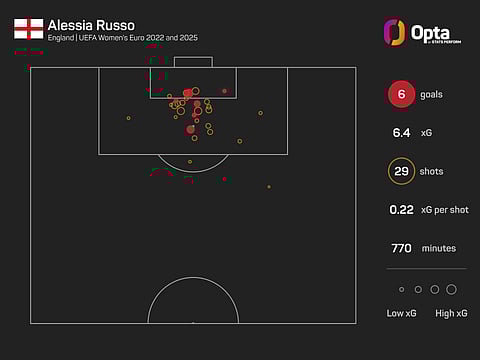 Russo, meanwhile, took her tally at major tournaments (World Cup/Euros) to nine goals, with only Ellen White (10) ever scoring more for England.