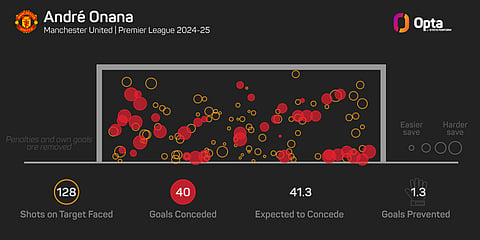 Onana did impress in the shot-stopping department at least, conceding 40 goals (excluding own goals and penalties) from shots with an expected goals on target (xGoT) value of 41.3, meaning he effectively prevented 1.3 goals.