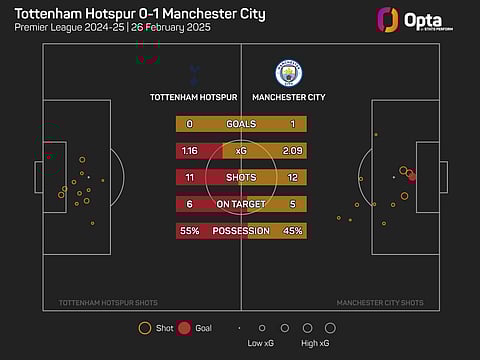 Spurs lost the expected goals (xG) battle 1.91 to 0.06 in the first half, but won it by 1.1 to 0.18 in the second period, limiting City to one shot on target after the interval.