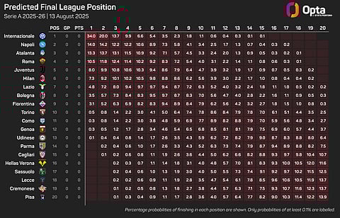 Napoli, Serie A champions last season, have a 14% title probability, behind Inter’s 34%
