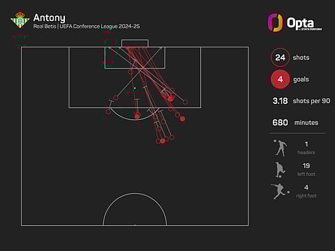 Antony has been involved in seven goals in eight Conference League appearances for Betis (four goals, three assists), having scored just two goals – and failed to supply an assist – in 17 European appearances with United.