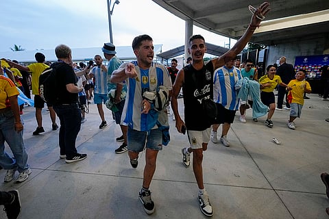 Fans wait to enter the stadium prior to the Copa America final soccer match between Argentina and Colombia in Miami Gardens, Florida.