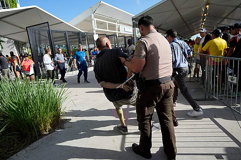 A security agent assists a fan who was waiting to enter the stadium prior to the Copa America final soccer match between Argentina and Colombia, in Miami Gardens, Florida.