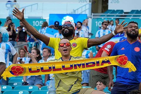 Colombian fans cheer as they wait for the start of the Copa America final soccer match between Argentina and Colombia in Miami Gardens, Florida.