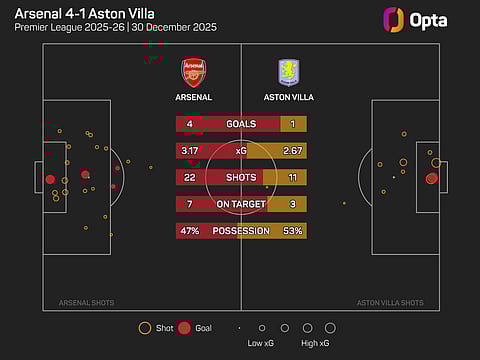 Mikel Arteta's side won the expected goals (xG) battle by 3.17 to 2.67, though Villa's figure was massively enhanced by a slew of stoppage-time chances at 4-0 down.