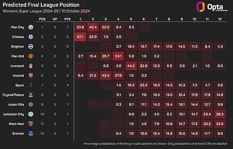 Arsenal, on the other hand, came out on top in 32.5% of the model's simulations, so expect a tight encounter, with the draw threat at 25.5%. While they are unbeaten in the WSL this term, it really does feel like Eidevall needs a win to ease some doubts.