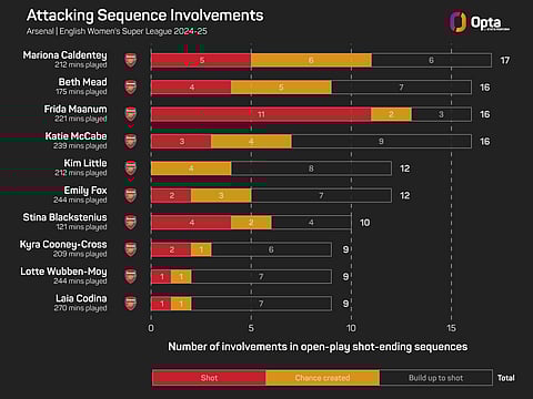 However, the World Cup winner is yet to record a league goal contribution this season since her arrival from the Catalan giants, despite leading the way for open-play shot-ending sequences in Arsenal's squad (17).