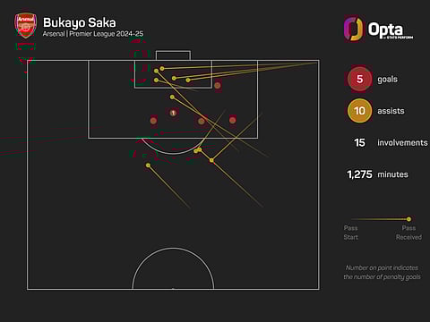 Saka has scored five goals and provided 10 assists in the Premier League, with only Mohamed Salah (17) setting up more goals this term (Antonee Robinson and Mikkel Damsgaard also 10).