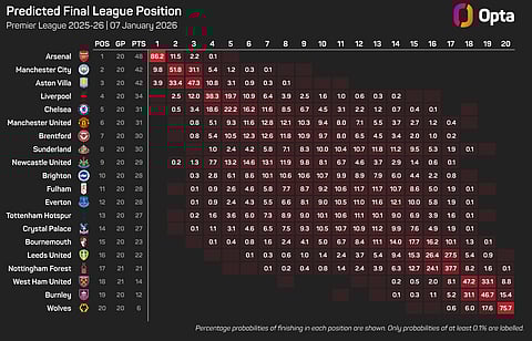 Arsenal sit atop the English Premier League 2025-26 table with 48 points from 20 games